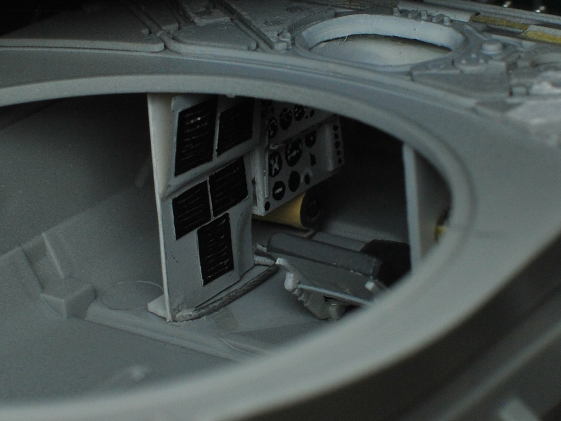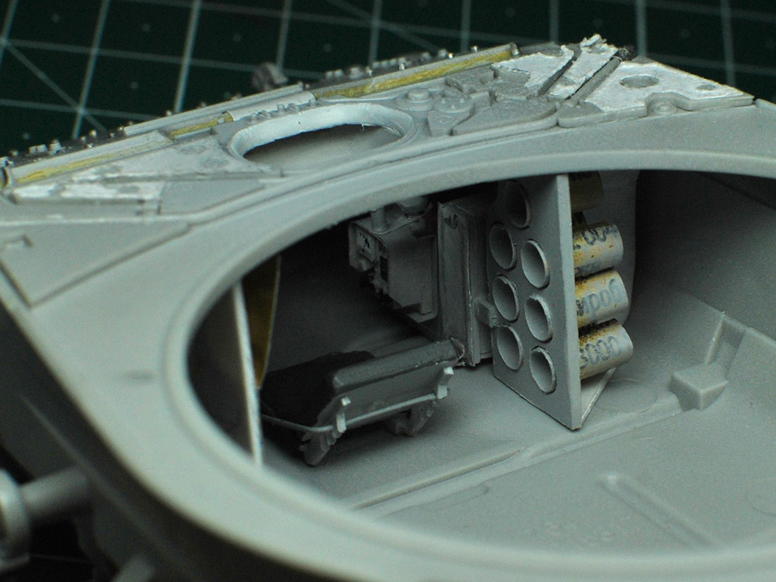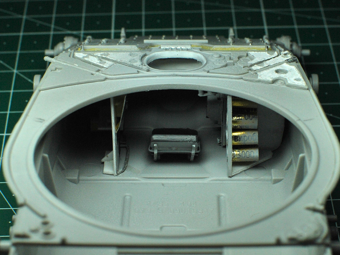 Маленький, еле заметный сквозь люк мехвода прогресс - боеукладка поправую его руку: