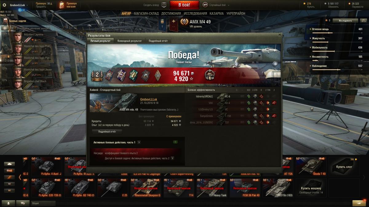 Всем советую купить этот прем танк. Броня в купе с отличным орудием, данный агрегат претендует на роль лучшего тяжа 8 уровня. Враги будут уезжать с вашего фланга, но мощность вашего двигателя не позволит им это сделать. Так же не малым фактором при выборе танка будет являться ускоренная прокачка экипажа и увеличенный заработок серебра. Почувствуй роль брони в игре- купи AMX M4 mle. 49. !