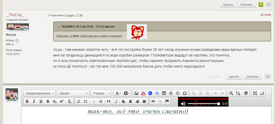 RenamedUser_97212858 Опубликовано: 16 сентября, 2018 Игроки 229 публикаций Жалоба Поделиться Опубликовано: 16 сентября, 2018 http://cdn-frm-eu.wargaming.net/4.5/style_images/wg/snapback.pngTAGAN84 (16 Сен 2018 - 17:42) писал:Обратись в ВМФ США,там расскажут и покажут. та да - там никаких секретов нету - всё что постройки более 25 лет назад изученно всеми разведками мира вдольи поперёк.мне каг владельцу движущейся по воде коробки размером 77х340метров выдадут её чертежи, это понятно,но я хочу посмотреть компоновочные чертежи щяс, чтобы заранее продумать варианты реконструкции.ну пока ЦБ теляться - каг-так мне 100-200 мильйонов баксов дать чтобы никто недогадался Ссылка на комментарий Поделиться на других сайтах Другие способы поделиться...