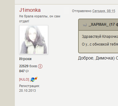 PTITSIN Опубликовано: 17 февраля, 2021 Игроки 7 625 публикаций 44 548 боёв Поделиться Опубликовано: 17 февраля, 2021 http://cdn-frm-eu.wargaming.net/4.5/style_images/wg/snapback.png3A_PBAHblE_TPYCbl (17 фев 2021 - 19:33) писал: А что эт вы?Ща типа модно аватарки менять?А я почему не знаю? Труселей рваных больше нет...так что вы мимо.. Ссылка на комментарий Поделиться на других сайтах Другие способы поделиться...