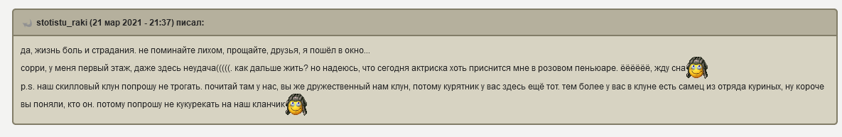 stotistu_raki Опубликовано: 21 марта, 2021 Игроки 5 583 публикации 248 боёв Поделиться Опубликовано: 21 марта, 2021 http://cdn-frm-eu.wargaming.net/4.5/style_images/wg/snapback.png65FIV (21 мар 2021 - 21:50) писал:ку-ка-ре-куу вас там уже 3 часа ночи?http://cdn-frm-eu.wargaming.net/4.5/style_images/wg/snapback.pngaktriska (21 мар 2021 - 21:53) писал: донику совсем поплохело, он сам с собой начал разговаривать)в цитату подставляет мой ник что делать будем?зая, ты же с администрации, потому должна знать, что цитату можно отредактировать, но вот ник нет - потому не наговаривай на меня, пожалуйста Клан Для Любителей Гнуть Арту [AZIS_] Ссылка на комментарий Поделиться на других сайтах Другие способы поделиться...