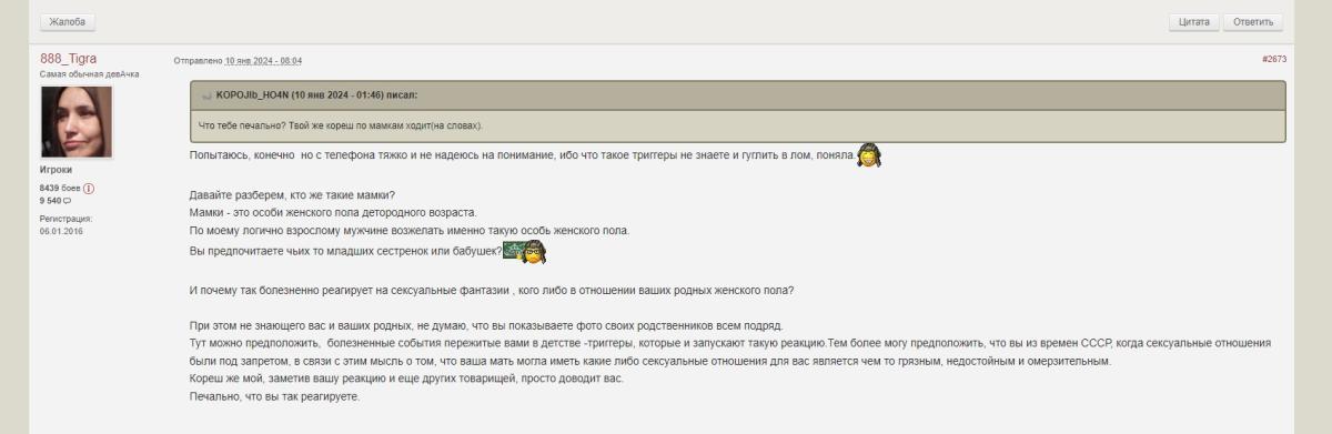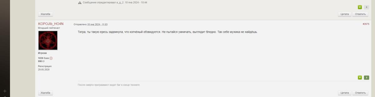 _XAPMAH_ Опубликовано: 24 марта, 2024 Игроки 5 494 публикации 408 боёв Жалоба Поделиться Опубликовано: 24 марта, 2024 23 мар 2024 - 21:11 пользователь 888_Tigra сказал: А ты все правильно написала и нечего извиняться. Если у чувака, проблемы с пониманимаем написанного, или с психикой это его проблеммы, а не твои. Доброго вечера всем. Да, я не понимаю твоего дружка - мамколюбаДа, я не понимаю как на утро после трагедии - написать с добрым утромСогласен, психика другая в отличии от Вас для которых это норма. Ссылка на комментарий Поделиться на других сайтах Другие способы поделиться...