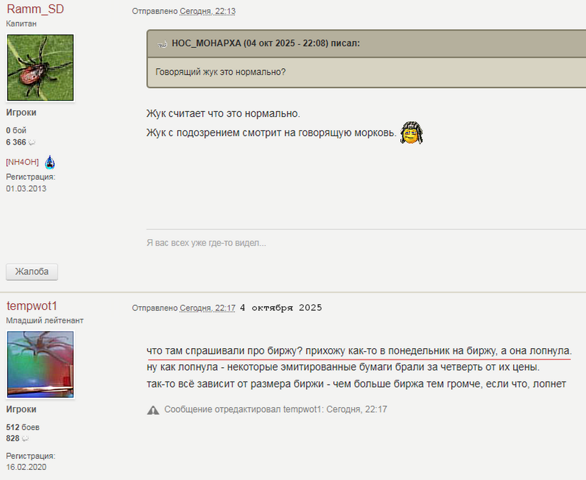 tempwot1 Опубликовано: 14 октября, 2025 Игроки 1 858 публикаций 512 боёв Жалоба Поделиться Опубликовано: 14 октября, 2025 (изменено) 13 окт 2025 - 22:20 пользователь HOC_MOHAPXA сказал: Жук, а может ему помощь нужна?Давай отведём его к кузнецу, на кодировкуэто намёк что "фаталист" всё ещё "подшитый"? или таки "расшился"?*теоретически он мог "расшиться", потому-что когда нет денег ни на что кроме "бояры"... *а практически мне этого пока-что доподлинно не известно, потому-что фидбэка не было Изменено 14 октября, 2025 пользователем tempwot1 Ссылка на комментарий Поделиться на других сайтах Другие способы поделиться...