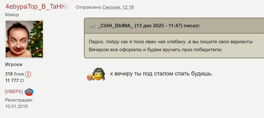 4ebypaTop_B_TaHKe Опубликовано: 13 декабря, 2025 Игроки 12 254 публикации 318 боёв Жалоба Поделиться Опубликовано: 13 декабря, 2025 13 дек 2025 - 09:59 пользователь HOC_MOHAPXA сказал:Злое утро. болей там сибе молча.И очинь тижело.С этими, как ево.Пабочными ослажнениями. Ссылка на комментарий Поделиться на других сайтах Другие способы поделиться...