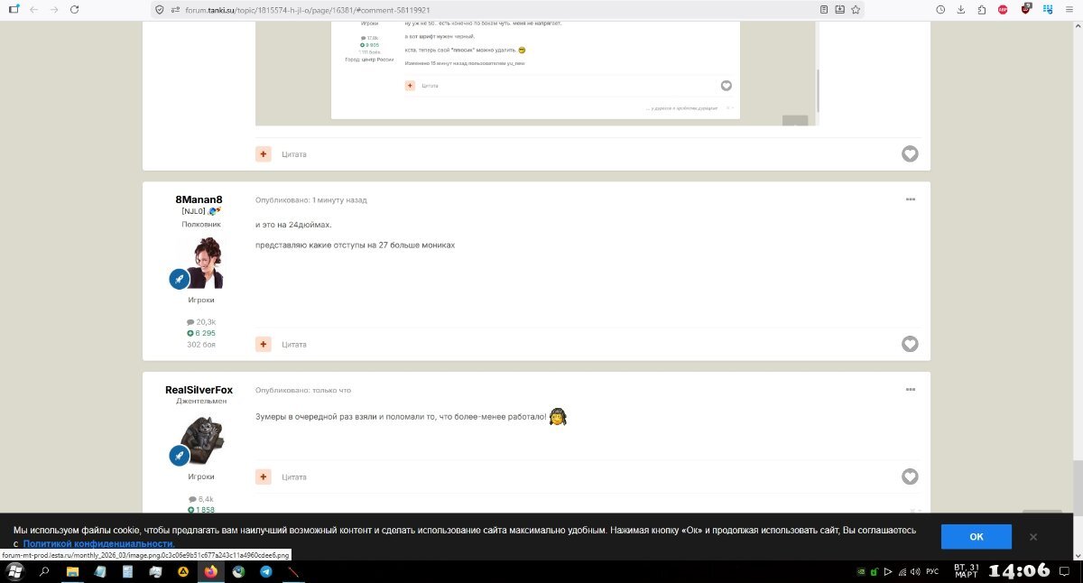 Ramm_SD Опубликовано: вторник в 10:12 Игроки 7 129 публикаций 29 842 боя Жалоба Поделиться Опубликовано: вторник в 10:12 7 минут назад пользователь sanya0154 сказал: Так надо Привет, Ден Здравия, Сань. Не говорят, когда статусы починят? 4 минуты назад пользователь yu_new сказал: всем прювет. а чо сломали? форум как форум. читать/писать в наличии.. чо распереживалисть то? Здравия, Юрий. Так, немножко поломали: шрифт стал блеклым, статусы отвалились совсем, мешанина в смайлах. Зато форум стал грузиться быстрее и прямой доступ к списку прикреплённых файлов появился. 3 Я вас всех уже где-то видел... Ссылка на комментарий Поделиться на других сайтах Другие способы поделиться...