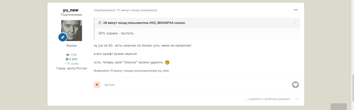 yu_new Опубликовано: вторник в 10:43 Игроки 17 846 публикаций 1 111 боёв Жалоба Поделиться Опубликовано: вторник в 10:43 (изменено) 12 минуты назад пользователь HOC_MOHAPXA сказал: 50% экрана - пустота. ну уж не 50.. есть конечно по бокам чуть. меня не напрягает. а вот шрифт нужен черный. кста. теперь свой "плюсик" можно удалить. Изменено вторник в 10:45 пользователем yu_new 1 ... у дураков и проблемы дурацкие Ссылка на комментарий Поделиться на других сайтах Другие способы поделиться...