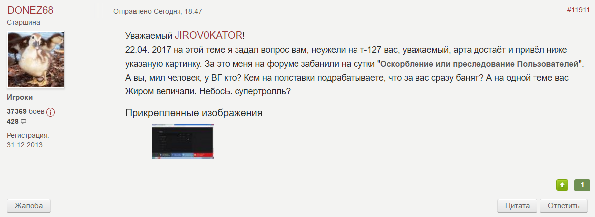 anonym_WGRkT5woh2Ni Опубликовано: 25 апреля, 2017 Игроки 31 953 публикации 28 991 бой Поделиться Опубликовано: 25 апреля, 2017 25 Апр 2017 - 17:56 пользователь OKone сказал: Кто наших обижает??? ты тему через страницу читаешь? тут над Оленькой уже чуть ли не неделю глумляться все, кому не лень. вапше у вас в клане чуваки странные Ссылка на комментарий