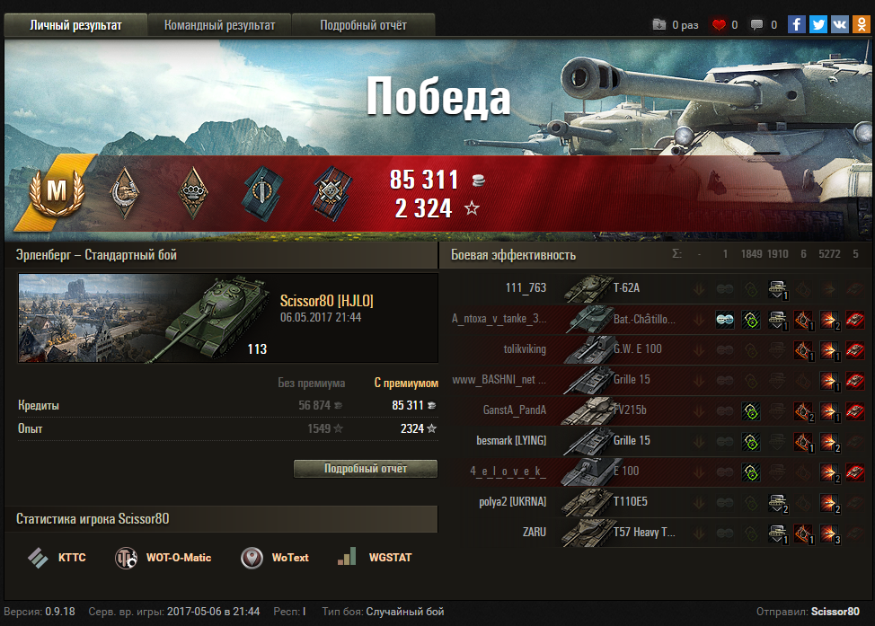Scissor80 Опубликовано: 6 мая, 2017 Игроки 23 377 публикаций 52 192 боя Жалоба Поделиться Опубликовано: 6 мая, 2017 06 Май 2017 - 23:42 пользователь LORD__LANCASTER сказал:Кто тут за 113-го меня агитировал ? Короч , буду качать Это игра, в Вашей жизни не произошло ничего страшного Ссылка на комментарий Поделиться на других сайтах Другие способы поделиться...