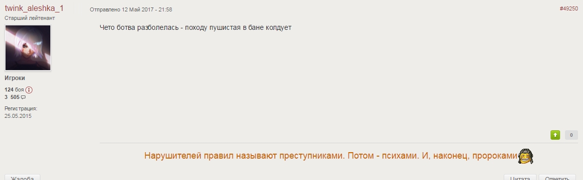 Miss_Olga Опубликовано: 18 мая, 2017 Игроки 2 855 публикаций 614 боёв Жалоба Поделиться Опубликовано: 18 мая, 2017 (изменено) 18 Май 2017 - 23:57 пользователь OJI9I_ сказал:Ладно. Всем спокойной ночи. Сладких снов. 18 Май 2017 - 23:59 пользователь sanya0154 сказал:А кто ты, глобал?Прочла цитату. Тут всё просто. Оно не банится по жалобе, знает когда я на него кинула жалобу, когда меня забанили - сразу же узнало Изменено 18 мая, 2017 пользователем Olga_Dance Ольга. Ренегат квазирелигии "Честная игра". Печать вашей тишины. Ссылка на комментарий Поделиться на других сайтах Другие способы поделиться...
