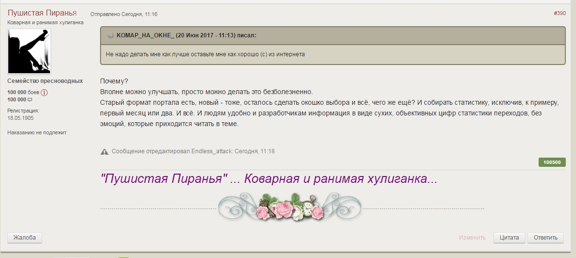 RenamedUser_24038909 Опубликовано: 20 июня, 2017 Игроки 4 612 публикации 101 бой Поделиться Опубликовано: 20 июня, 2017 20 Июн 2017 - 10:20 пользователь HeaDekBaTHa9I_ucTepu4ka сказал: Дак я тоже сдерживаюсь))Хотя...по большей части прост добрая но покусаная жистью - во, вот так)Какие мы сдержанные и понимаем друг друга, Вот признайся про 69 специально так написала?20 Июн 2017 - 10:21 пользователь Scissor80 сказал: и не говори, у миня скрины даже где то осталисьНадо было заархивировать её20 Июн 2017 - 10:23 пользователь EM_KOT9lT сказал: Можна жи попросить хорошо и ее откроютЙа уже так делал Надо просить, а еще не поздно? В кеше гугла её уже нет Начальник в бане, я за него. Когда вернется, не знаю. Ссылка на комментарий