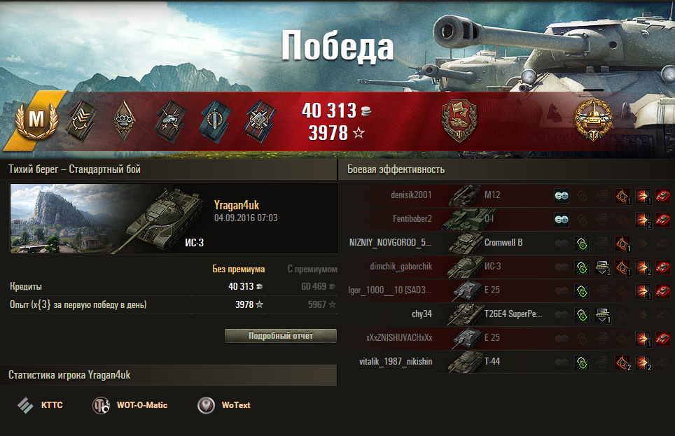 Yragan4uk Опубликовано: 6 ноября, 2016 Игроки 24 543 публикации 32 992 боя Жалоба Поделиться Опубликовано: 6 ноября, 2016 Случился со мной бойостался один против Е25 и арты, что делать ума не приложу, поеду убивать арту 25 базу возьмёт(а гоняться за ним нет смысла, да и пересветит) Союзник, здраво оценив шансы и мой уровень игрыhttp://cdn-frm-eu.wargaming.net/wot/ru/uploads/monthly_11_2016/post-8327541-0-06423000-1478410842_thumb.jpgпринимает "не стандартное" решениеhttp://cdn-frm-eu.wargaming.net/wot/ru/uploads/monthly_11_2016/post-8327541-0-72894400-1478410910_thumb.jpg Вот он ШАНС(пока думает что я у базы, поехать убить Арту) и первым стать на захват. Повезло, Арта была на берегу(хз чего он там ждал) но 25 раскусил "коварный план"http://cdn-frm-eu.wargaming.net/wot/ru/uploads/monthly_11_2016/post-8327541-0-21626700-1478411118_thumb.jpgправда союзник увлекся "процессом"http://cdn-frm-eu.wargaming.net/wot/ru/uploads/monthly_11_2016/post-8327541-0-95075500-1478411250_thumb.jpgно всё же, ПОБЕДАhttp://cdn-frm-eu.wargaming.net/wot/ru/uploads/monthly_11_2016/post-8327541-0-65702800-1478411553_thumb.png P.S. чуткое руководство спасибо союзнику и прощай чат(буду помнить, незабываемые мгновения проведённые вместе и закалку) 26 Ссылка на комментарий Поделиться на других сайтах Другие способы поделиться...