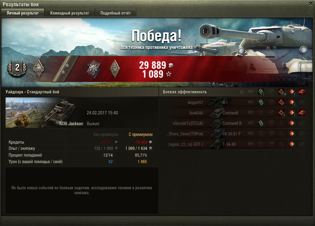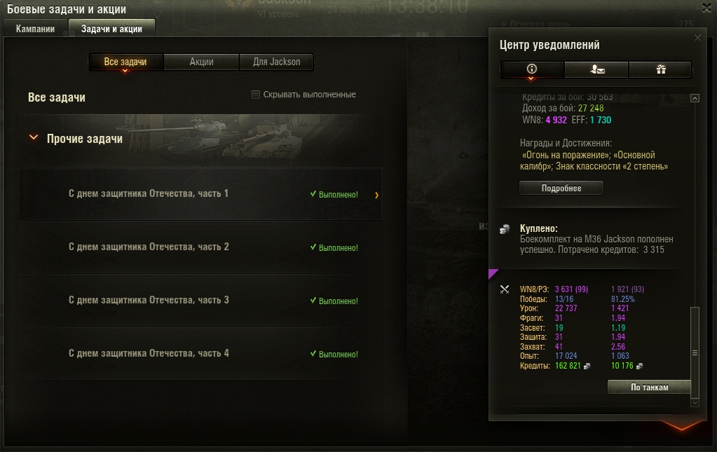 NUBYARA71 Опубликовано: 24 февраля, 2017 Игроки 16 316 публикаций 36 247 боёв Жалоба Поделиться Опубликовано: 24 февраля, 2017 Выкупил сёдня джексон, решил на нём взять три отметкиПроцесс пошёл http://cdn-frm-eu.wargaming.net/wot/ru/uploads/monthly_02_2017/post-4815636-0-06357000-1487941476.png Ссылка на комментарий Поделиться на других сайтах Другие способы поделиться...