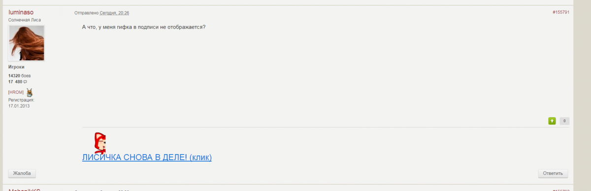 redbomb Опубликовано: 8 января, 2018 Игроки 50 506 публикаций 31 473 боя Поделиться Опубликовано: 8 января, 2018 08 Янв 2018 - 20:26 пользователь luminaso сказал:А что, у меня гифка в подписи не отображается?какаяа Ссылка на комментарий Поделиться на других сайтах Другие способы поделиться...