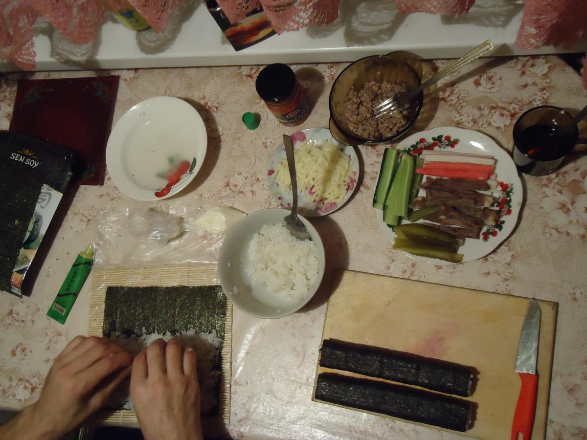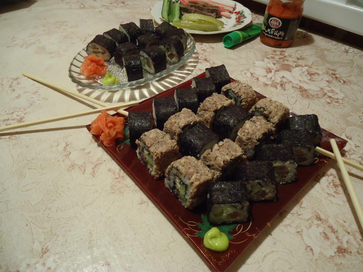 :great:  я бы тоже сегодня еще сделал, начинка оставалась, кончился уксус рисовый и в моих двух деревенских магазах его нет:(, а без него не то