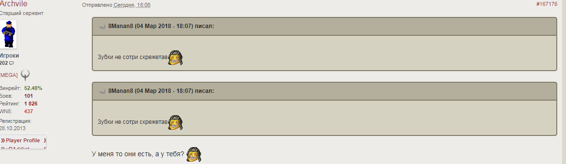 8Manan8 Опубликовано: 4 марта, 2018 Игроки 20 353 публикации 302 боя Жалоба Поделиться Опубликовано: 4 марта, 2018 04 Мар 2018 - 18:08 пользователь ArchviIe сказал: У меня то они есть, а у тебя? два раза перечитал что бы понять смысл?http://cdn-frm-eu.wargaming.net/wot/ru/uploads/monthly_03_2018/post-61040203-0-83476200-1520176295_thumb.pngЭкий ты тугодум Ссылка на комментарий Поделиться на других сайтах Другие способы поделиться...