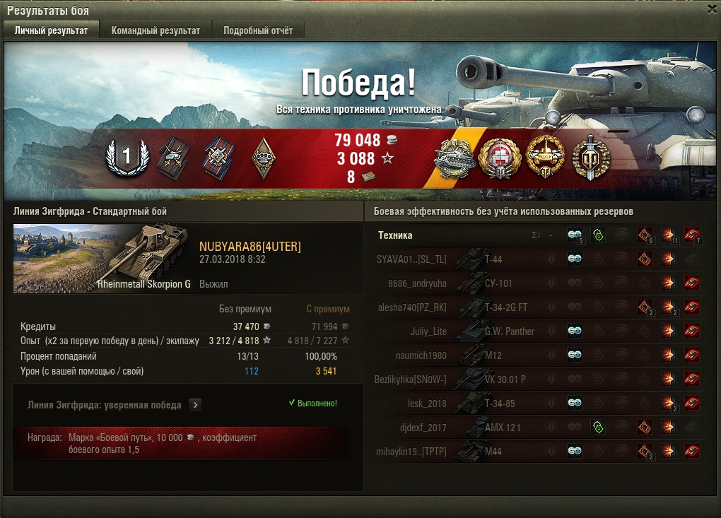 Yragan4uk Опубликовано: 27 марта, 2018 Игроки 24 543 публикации 33 010 боёв Жалоба Поделиться Опубликовано: 27 марта, 2018 27 Мар 2018 - 09:01 пользователь la_Pecheresse сказал:Всем доброе утро!!! Ссылка на комментарий Поделиться на других сайтах Другие способы поделиться...