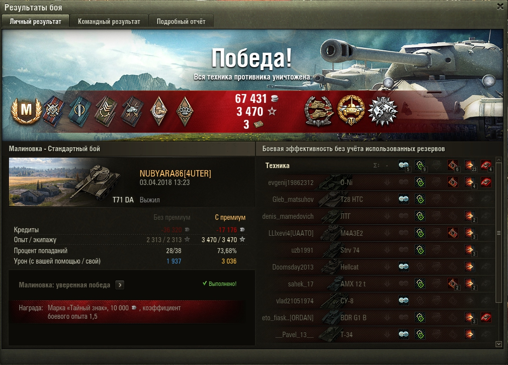 4epHbIu_BJlacmeJIuH Опубликовано: 3 апреля, 2018 Игроки 12 430 публикаций 23 325 боёв Жалоба Поделиться Опубликовано: 3 апреля, 2018 уря выпала молинофка пичалка шо в я был в топе и общее количество ХП команды противника было меньше 8к Ссылка на комментарий Поделиться на других сайтах Другие способы поделиться...