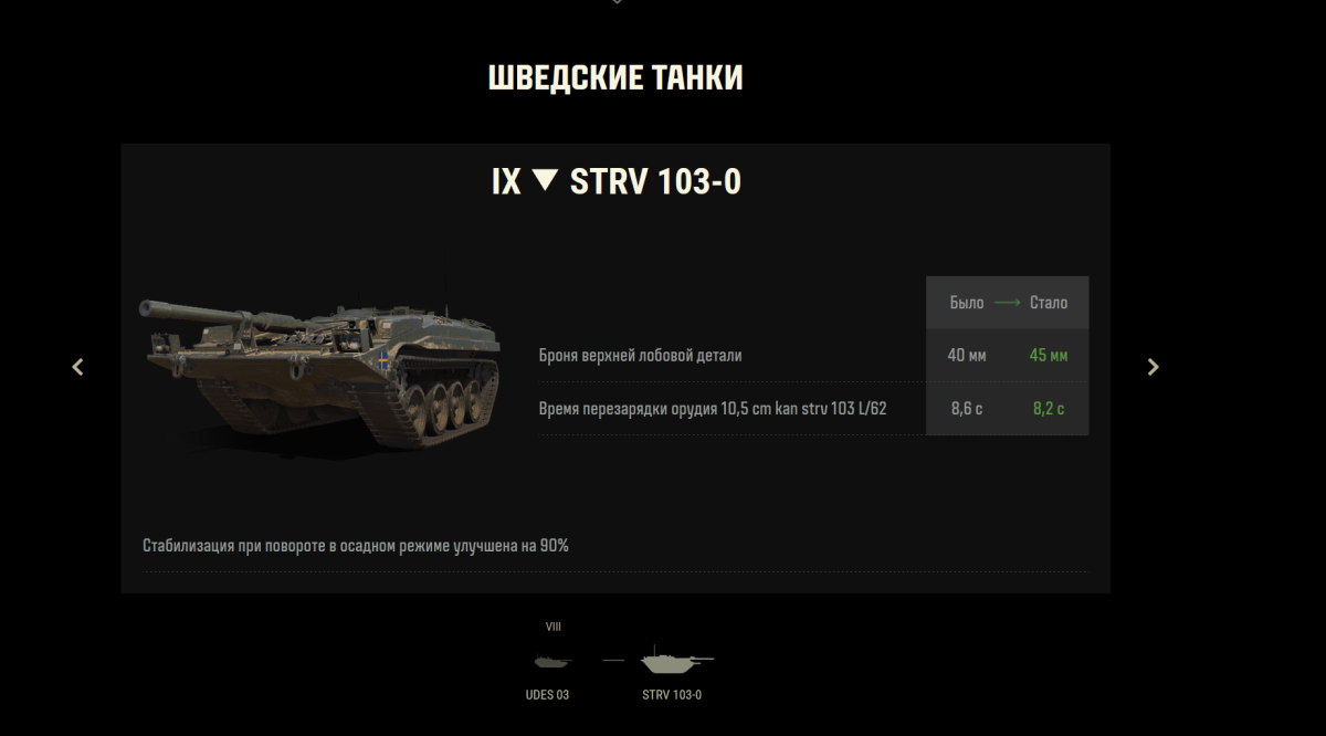 У ПТ САУ strv 103-0 9 уровня скрыто изменили бронирование нлд с 40 мм на 45 мм, что сделало её сильнее по бронированию, чем ПТ САУ 10 ЛВЛ "Strv 103B".