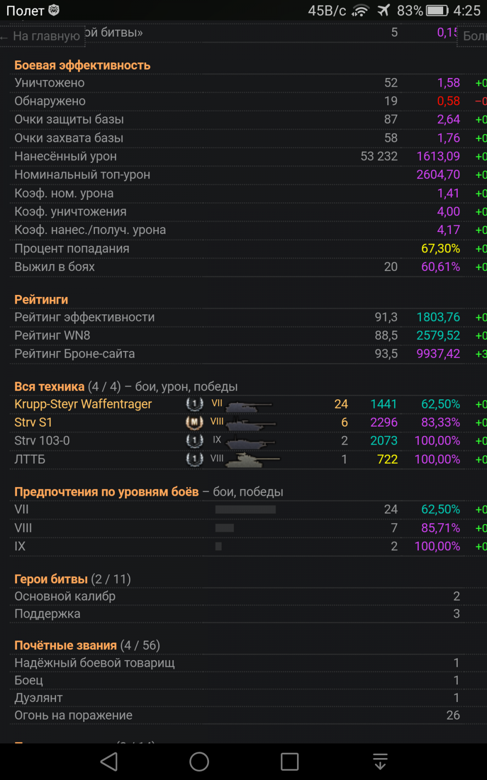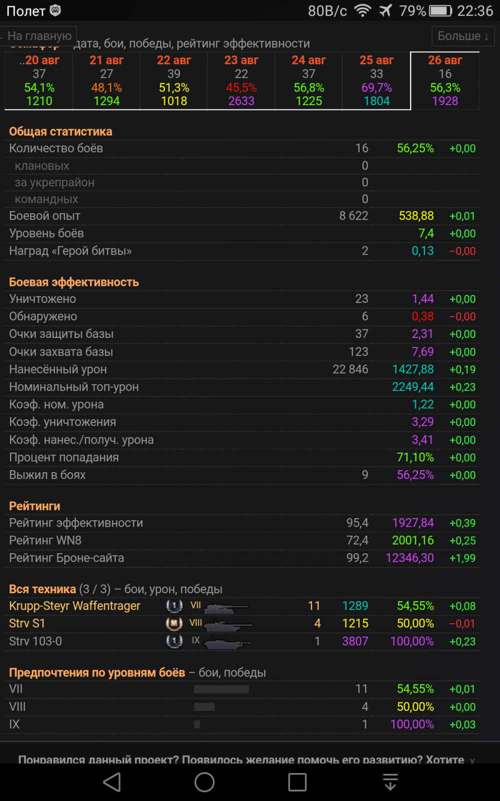 Накатал вчера около 20 боев на штыре. 12 сливов с дамагом 0-450. Ваншотили арты на все 800, сам тупил, мазал и не пробивал. Потом четыре раза вышел за 3000 дамага за бой, воина взял. На фьордах, неудачно высунулся, отхватил залп, остался с 70 хп. И сделал 5 фрагов и 3240 дамага. Зато швед пт шли вчера замечательно.