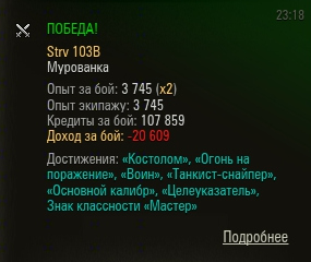 Я не часто Стрв 103Б катаю. Ибо снаряжена она у меня по полной программе, для комфортных покатушек, что в финансовой части - довольно накладно. Ещё бы боновый турбонагнетатель на неё... :playing: