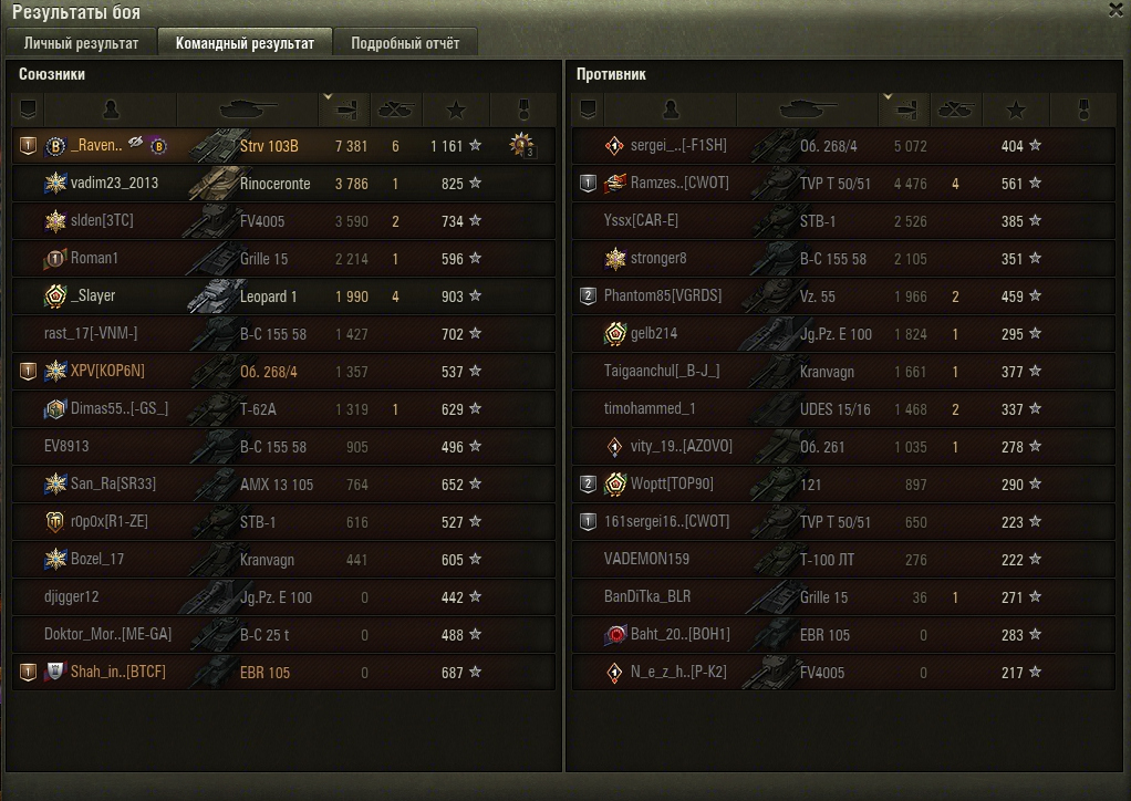 Остались в 3-м (+1 арта), против 5 (+1 арта), наши Носорог и Леопард были на 1 выстрел, и целым был я. Спасибо Леопарду за своевременный подсвет другого фланга. А свои хп я разменял на пострелушки лоб в лоб с Об. 268-4. Вытянули сливной бой :B