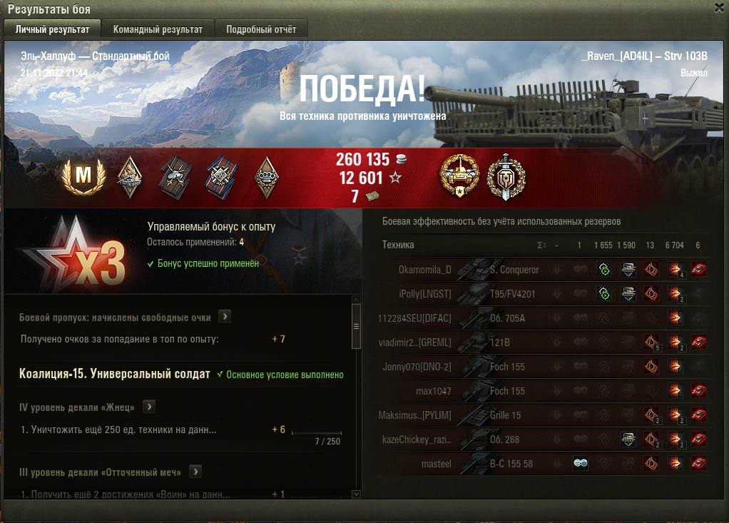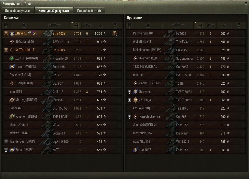 Спасибо вражеским Фошу 155, Грилю 15 и артоБатШату, что сами приехали к нам на базу, хоть бегать искать не пришлось. Пока убивали нашу арту, а они поехали аля ПТ на противника, не понимаю зачем. На перекатке поймал Фоша, добил, по засвету арты, пока Гриль пытался убить нашего Об. 261, я убил Грилля, выстрел с попаданием и пробитием на ходу + таран. Приехал артоБатШат, он убил нашего Об. 261, пока он это делал, я ему ≈100 хп оставил, и потом весёлые догонялки вокруг горки. Когда догнал, на ходу, увы не попал, поэтому протаранил. Ещё 261-й написал, мол, вот тебе воин. Спасибо, такие воины мне не нужны, особенно на Strv. При чём, это вчера был 1-й бой из серии.