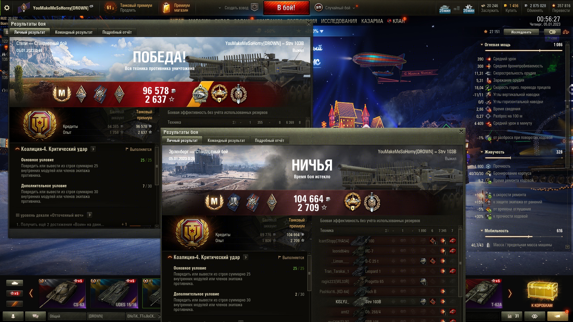 Давно стояла пылилась в ангаре, решил поиграть - оказалось не скучно. В целом, танк интересный, катал на вентиле, турбе и досылателе. Для Прохоровки зарядил оптику и малошумку, но они так и не пригодились, хотя на одной Прохоровке таки произошел насвет 8к ибо не было лт в бою. В кустах стоять много не пришлось, очень часто выпадали городские карты (привет Химки и Энски друг за другом). В принципе, даже в упор за счет ДПМа наигрываются интересные моменты. Хоть какое-то разнообразие от метового геймплея.
