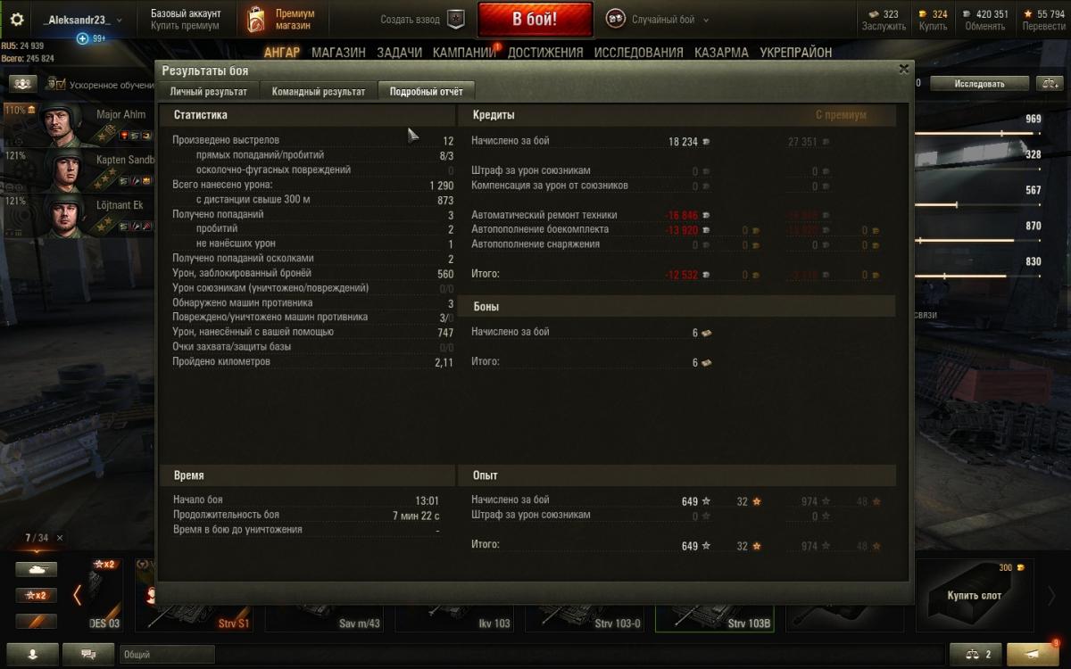 Покатав три дня, продал ее. Видимо, не мой танк. Когда я сбиваю звезду по 5-7 боев, а сегодня 6-ю попытку делать не стал. На стрв с1 за сессию 2444 дамаг, на штейре 1800, и на 103в 1500. Из 10 боев 1 победа. Жаль, попробую вернуться к 103в через пару лет. Всем хороших боев.