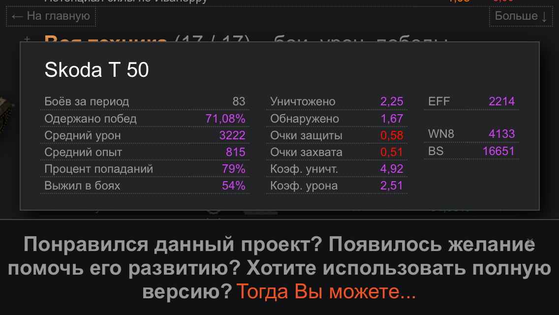Не могу согласится. Судя по кттс - у шкоды т50 55,7% побед, что очень много и среднтй урон 2020, что тоже прилично! Для сравнения у бата 9 лвл среднтй урон 1390 у т54 еще нтже.