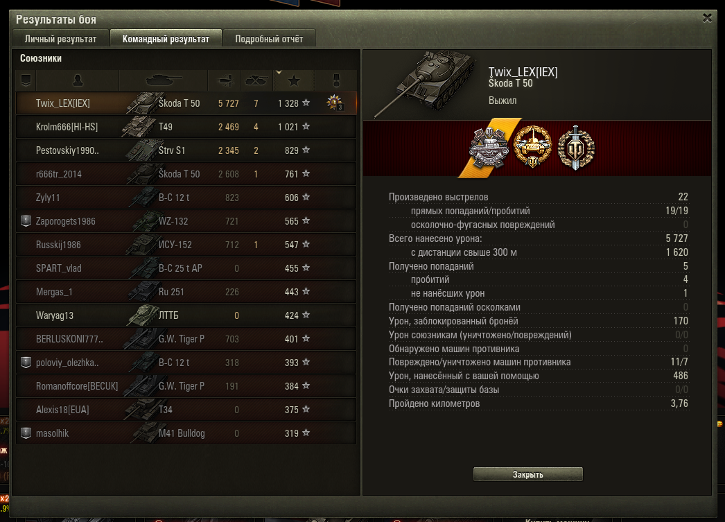 Взял вчера мастера, попутно выполнив СТ-13 на Т-55а (6К дамага там надо). Нанес 7К урона, пошел в бой как раз для лбз с мыслью что наверное никогда мне его не выполнить (давно пытаюсь и играю только соло) и вдруг все звезды легли как надо, был в шоке. Дело было в Энске, кстати.