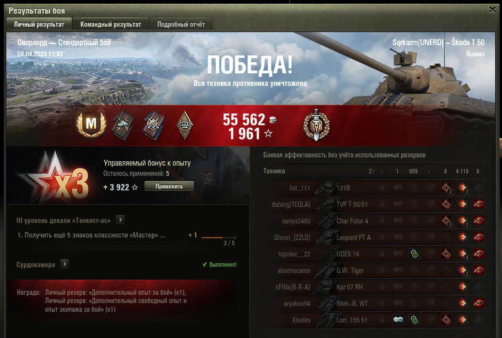 Так, падажжи, другалечек. Ты все пытаешься меня так смешно поддеть за мои, типа, кривые руки. Почему бы тебе не посмотреть сессионки на той самой т50? Она у меня с релиза с заморозке была, на примерно 100 боях и играл я тогда(со стока) еще так себе. Последние сессии были 2500~ и это уже показатель.