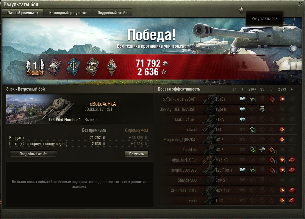 • Не смог выполнить ЛБЗ/докупить задачи и получить танк в ангар, жалею