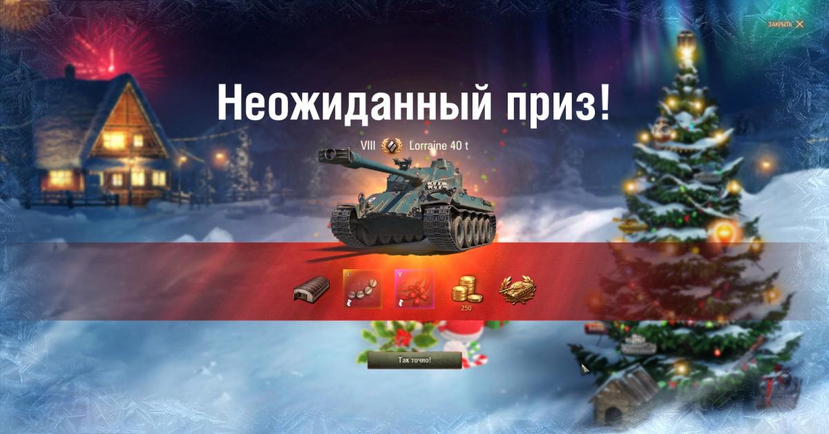 Я купил сначала пак 45 коробок (45% скидка). Прем танков, если не считая 4-го уровня, не было. Но, так как было 15000 золота, пару миллионов серебра, 20 дней према, 48% прокачалась елка (максимальное значение), остался доволен. Потом, купил пак 20 коробок (20% скидка), выпал Т26Е5, а потом выпал же он еще раз. Так как двух одинаковых премов не бывает, в ангаре появилась Лорка. Потом я купил еще пак 45 коробок (ради золота, серебра и премов), выпал scorpion G. Всего было 100 дней према, 30 000 золота, 4 000 000 серы.