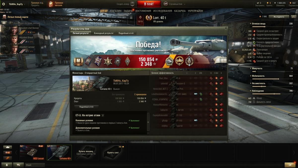 Привет всем. На днях купил лоррейна так как хотел составить компанию товарищу и поездить взводом вместе на одинаковых СТ. Скажу сразу, я иногда такую и мне пока Лорка не сильно понравилась, хотя бывают и приятные моменты. Да танк дамагер, да быстро ездит, да есть обзор. Но что не понравилось, так это портные бои на нем и часто необходимость убегать с фланга и нет возможности остановить даже раш 2 СТ 7 уровня. В последнее время разработчики нас попытались порадовать и выпустили 4 убермрпма. Это защитник, скорпион, Лоррейн и Стив с1. Защитник ладно, он классический совковый тяж, ис7 на 8 уровне. Но остальные 3 према из 4 страдают тем, что они не универсальные. Раньше был супертанк среди премов, тип 59 и он мне нравится тем что он обычная СТшка и во многих ситуациях мог себя проявить. Сейчас же выпустили 3 према 'для прострела перекаток;)))) Да, мне с лоррейном нужно или руки прямить или отложить его до лучших времён и посмотреть видео, где на нем хорошо играют.