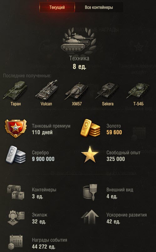 Итого на сегодня открыто 192 контейнера. Получил 8 танков, для закрытия 2-го этапа осталось выбить ШтугМауса.
