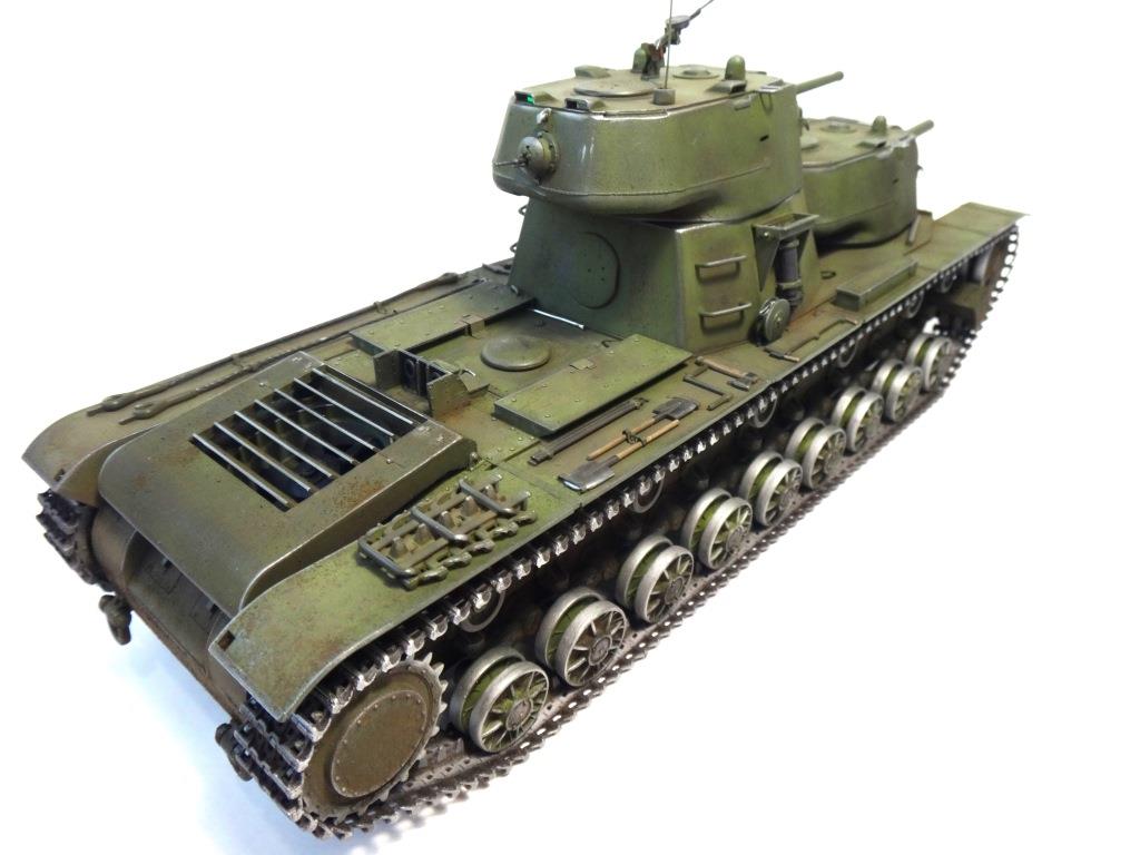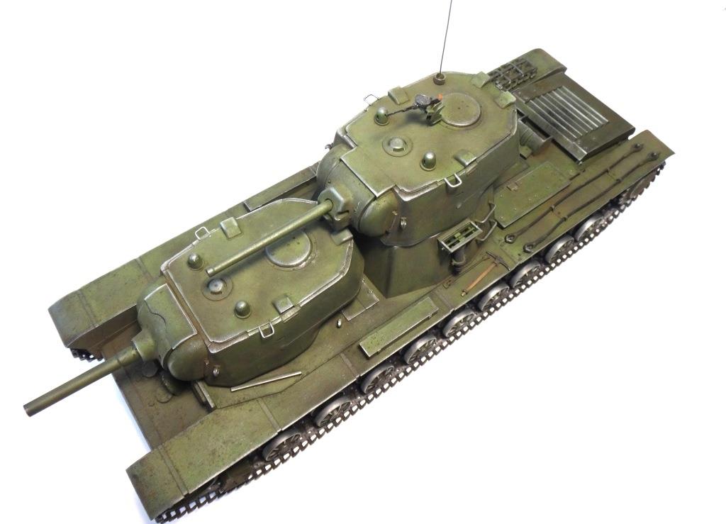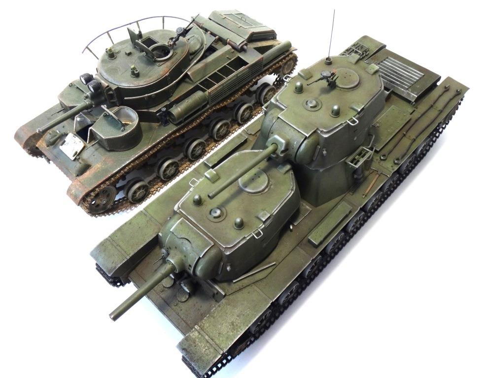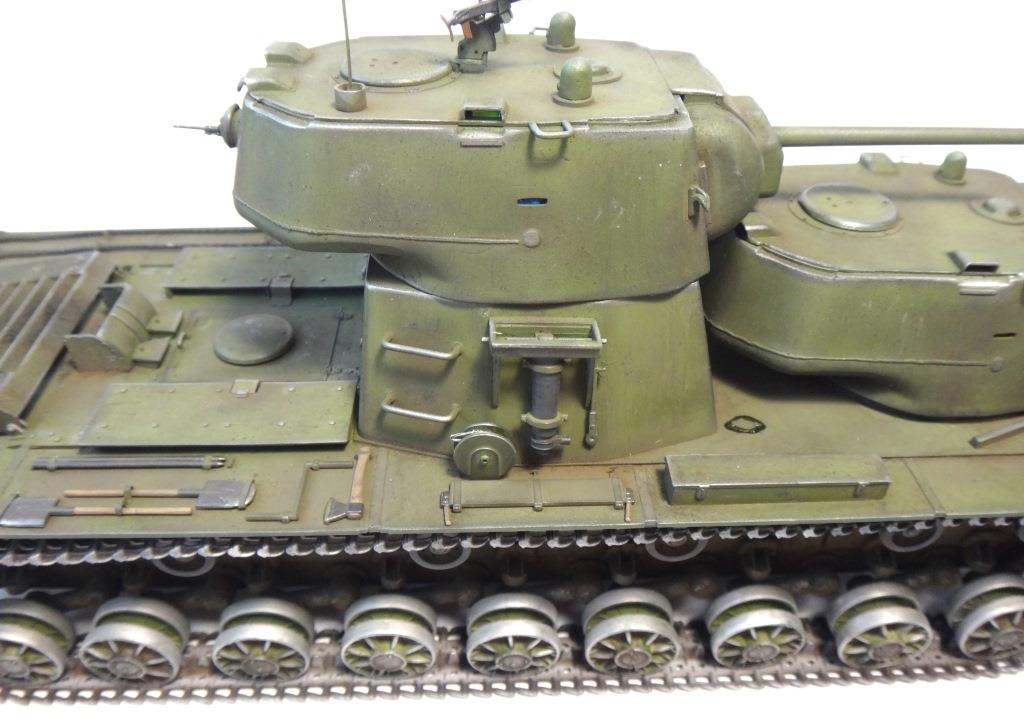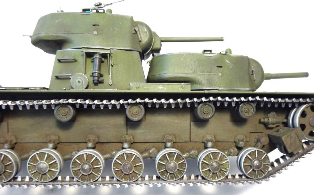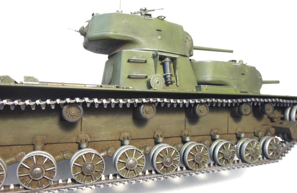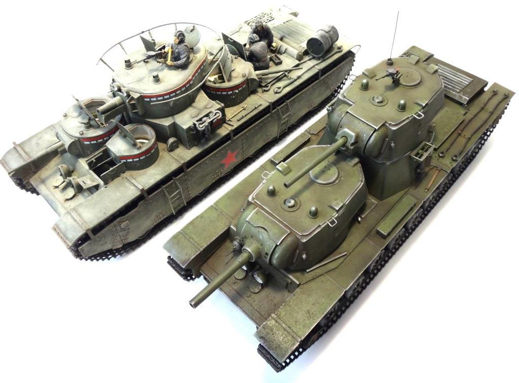 DW969 Опубликовано: 14 мая, 2017 Игроки 237 публикаций 19 380 боёв Жалоба Поделиться Опубликовано: 14 мая, 2017 (изменено) В рамках проводимого на форуме ARTMODEL конкурса альтернативной техники, собран возможный вариант модернизации танка Т-35, с использованием агрегатов и вооружения танков КВ с 76-мм пушкой и 122-мм гаубицей. Кроме пушечного вооружения танк имеет пять пулеметов (из них один зенитный). Бронирование усилено за счет установки экранов на бортах корпуса и передней проекции. Верхний броневой лист заменен полностью.Подвеска машины - торсионная, применяемая на танках КВ. Силовая установка так же от КВ. Однако менять систему охлаждения и отвода отработанных газов не стал. По этой причине внешних изменений по силовой установке на корпусе машины не видно. Трансмиссия без изменений.На сколько изменилась масса машины судить сложно. Конечно она выросла, но насколько можно только предполагать. На машине сняты боковые экраны и удалены все пять башен. Одновременно с этим для придания брони противоснарядного бронирования, установлены дополнительные листы с бортом и носовой части машины. Конечно скорости или проходимости лишний вес не добавит. Но этой машине особая скорость и не требуется.Основное вооружение выбрано с целью увеличения возможностей машины как по ведению огня по бронированным целям и пехоте, так и для подавления огневых точек, защитных сооружений и скопления техники и личного состава противника.Получившийся вариант модернизации назван Т-35БМ - большая модернизация.Такой вариант вполне себе мог быть. Собрана модель на основе Т-35 от "Звезды", части комплектов моделей танка КВ-1 от "Восточного экспресса". Остальное - самодел.Окрас и химия от Японского производителя.Спасибо за внимание! Удачного просмотра и анализа получившегося варианта танка Т-35. Изменено 14 мая, 2017 пользователем DmitriyDW 12 Ссылка на комментарий Поделиться на других сайтах Другие способы поделиться...