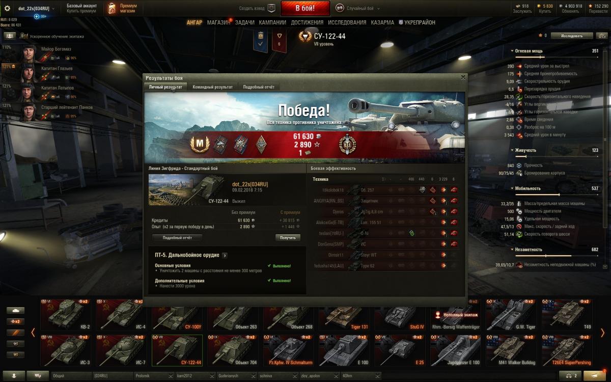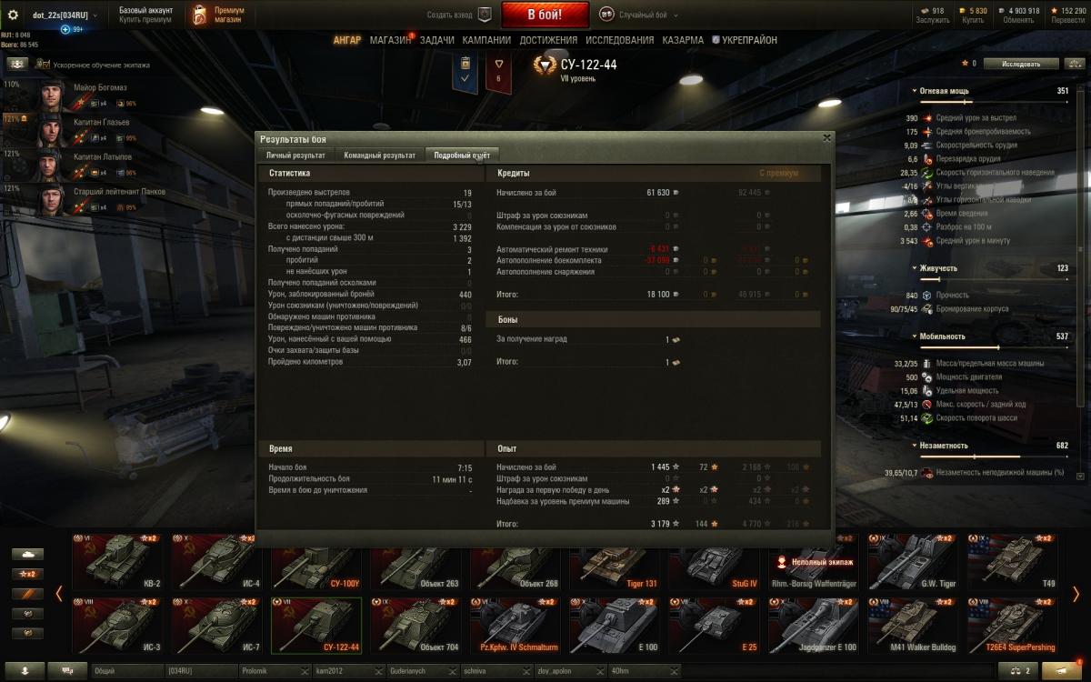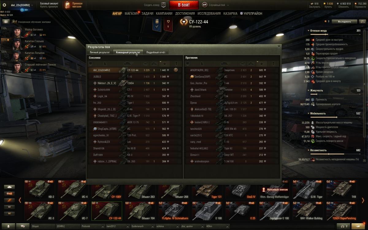 Это был моя вторая основная техника для заработка кредитов в игре (первый тайп 59). Когда было необходимо катал поочередно. После перерыва в игре в три года (до ноября 2017 если быть точным) обнаружил, что СУ-122-44 стал просто неактуальным. В средне-дальних дистанциях он и раньше не блистал, конек его бои на малых дистанциях. Но увы и ах - обилие железобетонных "япошек", высокопробивных орудий и обладателей магазинов на квадратный метр сделали из этого ПТ кусок железа. Каждый второй бой теперь вытягивают папки на высокоуровневых лт. Хороший ДПМ все еще при нас, несмотря на слабое бронепробитие бб, априори ездить на фулл голде, на преме никто не станет - растеряется весь смысл покупки, при том что фан от его катания весьма сомнителен - это не "задиристый" Е25. Ситуацию могло исправить изменение углов наводки или кардинальное уменьшение времени сведения (у меня множество случаев выноса артой при прямой наводке при остановке - банально она раньше сводилась :teethhappy:, а автоприцел удручает) но увы, вышедший патч с ребаллансом советов оставил СУ-122-44 за бортом, несмотря на легкий ап базы - Т-44.