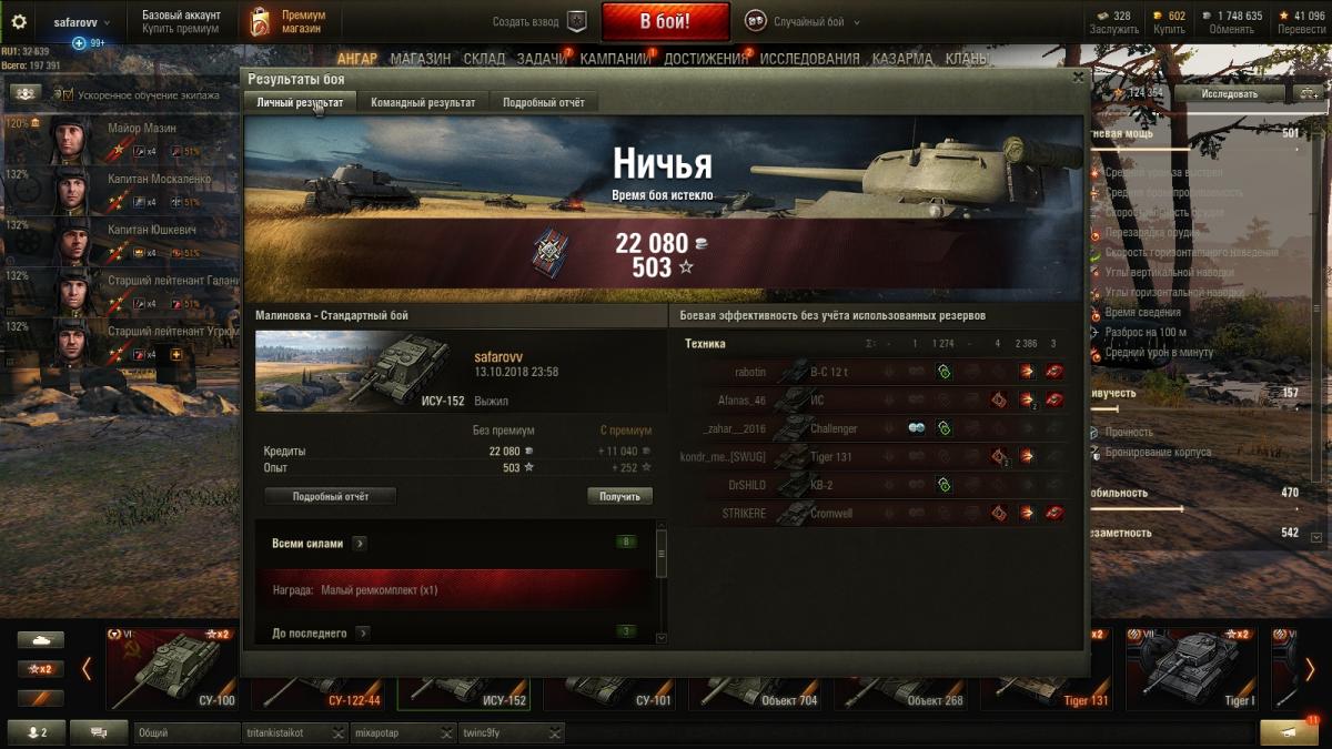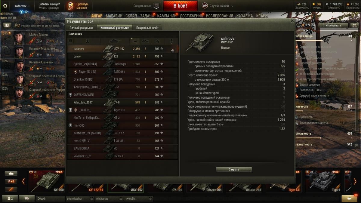 Вот что  сила животворящего фугаса делает ...ну, или как там  ...  Но увы, даже она   не способна изменить тот факт, что ИСУ нынче - гроза лишь   шестерок-семерок ,иногда восьмерок ...http://cdn-frm-eu.wargaming.net/wot/ru/uploads/monthly_10_2018/post-2225016-0-24303200-1539297343_thumb.jpg   В игре  творится что то  странное . Вчерась - стаю на Леве  в кустах ЗА КУСТОМ на спуске с горы в Малиновке . Жду ягодного тигра 8.8. И он появляется, несущийся на полном ходу ,метрах в 100 от меня ,одновременно с  его выстрелом , отправившим  меня в ангар . Понятно - лева - тот еще не приметный муравейчик . Но ведь и ягодный - не е25 . И он  ехал . По чистому полю . Эпизод второй . Стою на ягпантер ЗАкустом ,  с  включенной   сеткой , машина в камуфляже , 100% маскировки , и включена труба . Метрах в 200  от меня ( или ближе  немного ) на  островке  ныкается  шотный  Т 44 .Вдруг включается лампа , я получаю - 250 хп  от него и  ..он при этом даже не засвечивается ...Ниньзя,блин ...