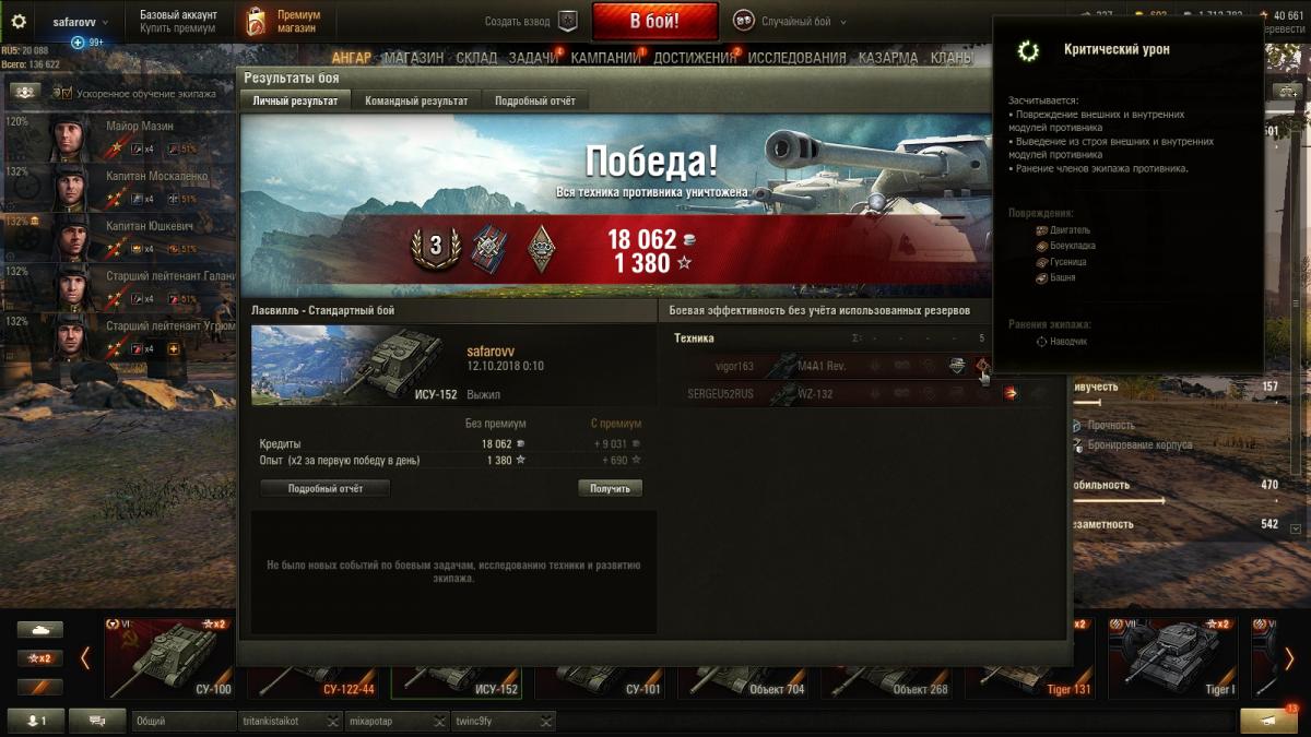 По поводу скрина : ну так калибр орудия то гаубичный, оглушение от такого снаряда должно быть, арта с таким калибром тоже глушит :) А характеристики  время оглушения и разлет осколков надо добавить ( прировнять к артовским). Вот тогда ИСУ 152 получит новую изюминку вместо отобранной  и ИСУ 152 заиграет новыми красками на д4с  :) и у ИСУ появятся новые обязанности в команде...пробил = хорошо, а непробил оглушение и стан тож в + команде. ну ка господа обсудите такой вариант ... родите истину в споре. :)
