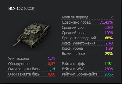 Свое слово всегда можно подкрепить каким то доказательством, в нашей игре это статистика за сессию или за какой то период времени,да те самые циферки:) вчера специально начал выкатывать ИСУ в рандом, всего  за вечер провел 8 боев, из них 7 на ИСУ, вот скрин результатов, да не скажу что результат космос, бывало на много лучше, но меня устраивает.Поэтому все эти споры  для меня это как спор Атеиста и верующего:trollface:буду дальше выкатывать ису, посмотрю еще что как, если кому надо выложу потом результаты, у меня прям интерес появился с одной стороны к ИСУхе опять, спасибо вам:D