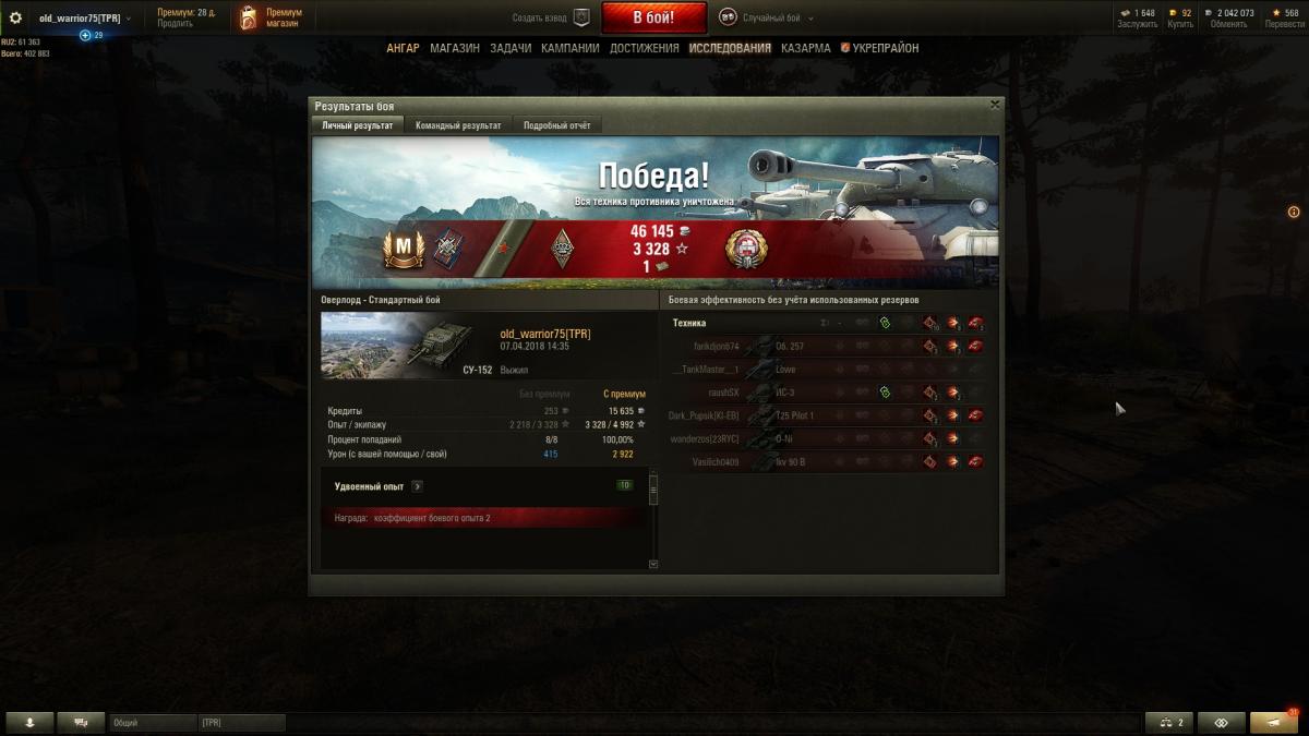 Су152 после обновы не изменилась, разве что выигрывать хронически перестала, кидает на 3к урона, а толку 0 если команда сливает, я вчера часа полтора пытался выиграть хотя бы 1 бой, в итоге из 25 боёв имею всего 1 тупую победу, в которой я только 400 урона сделал, не знаю с чем связано, но на других пт того же уровня, победы бывают через 2-3 боя, в среднем, и таких жёстких подгораний, как на су152,на них нет. Как пт, она не пригодна, так как огромный урон компенсируется отсутствием всего остального, как отмечалось выше, для комфортной игры нужно ставить досылатели, стабилизаторы, 3 перки на каждого члена, но логически посудите, это ведь бред. Т.е. скилл игрока уже не имеет значения, имеет значение суммарный скилл экипажа и оборудование, почему то даже со всем вашим мастерством танк не будет ехать как задано техниками, если виртуальный персонал не выкачан на 100%....