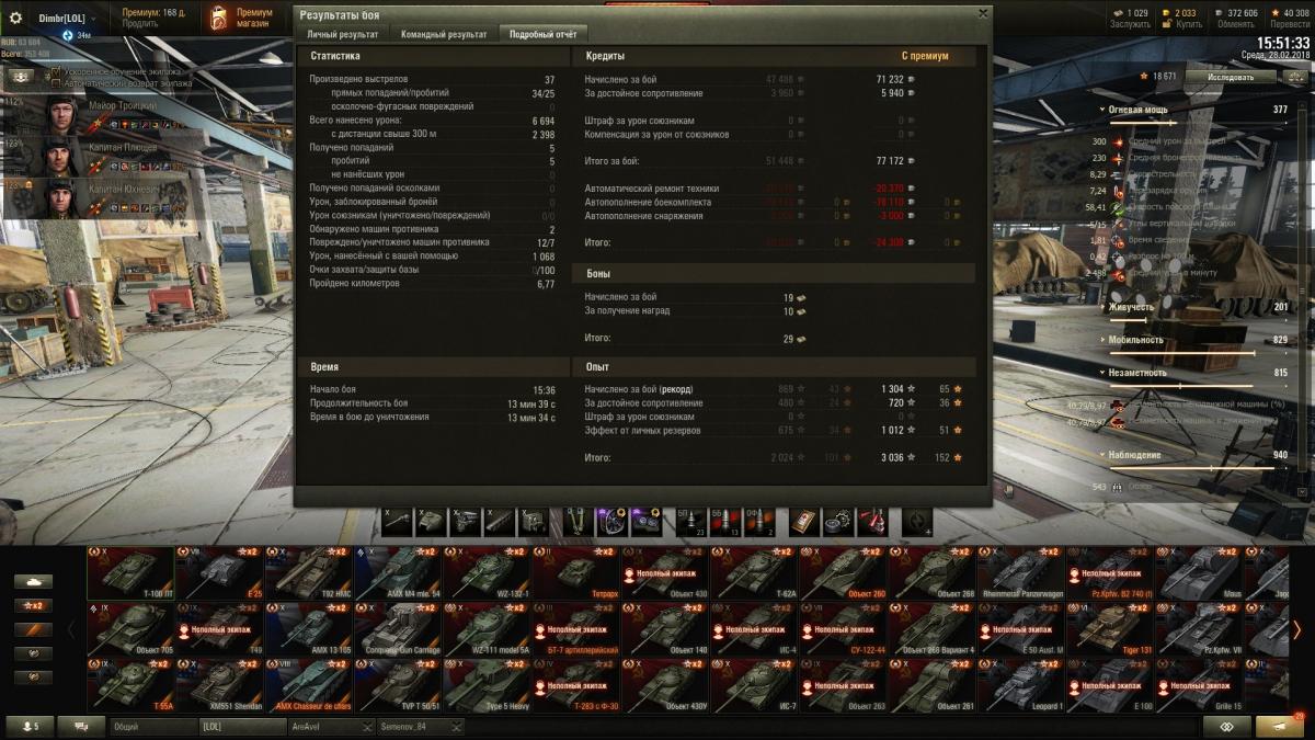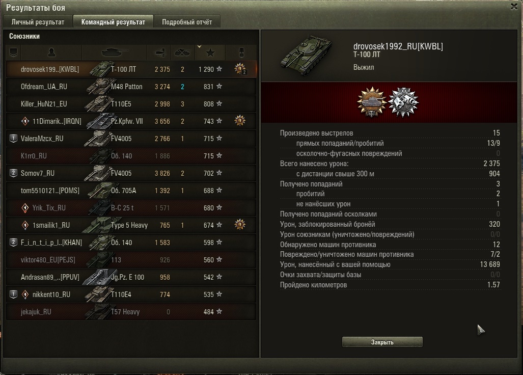 Субьективно, реально опыта дают только за фраги. Все остальное как-то совсем слабо оценивается. Кинуло на Малиновку, у противника Шеридан. Тупо поехал по прямой, нашел Шеридана который не успел в куст и сдох. Пол-боя светил пассивно, пока союзнички выковыривали застрявших у коровников Маусов и Алкотанк. Потом активный свет дефя спуск с проигранной горы, покидал немного по бортам ну и финальный упоротый рывок к кустовым ПТ и арте. 10к засвета, 1.5к дамага, 0 фрагов, 12 засвеченных фрагов, остался в живых. Третий по опыту. Первое место - Паттон с 4-мя фрагами и 3.4к дамага. Ок, парень реально играл. Но какого лешего второе место занял Алкотанк, который пол-боя набивал дамаг по моему засвету, а потом как-то смог утопится, не доехав до коровников? За 3к дамага, 3 фрага?