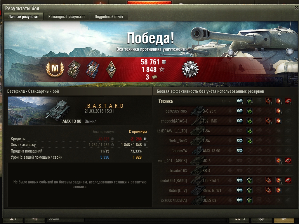 Блин, что сейчас нужно сделать, чтоб на танке мастера дали? Завалил трёх десяток, взял воина в городе, надамажил больше всех - первая степень. И ведь это настрел в упор, а не из кустов.
