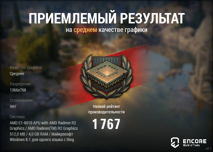 White_Polar_fox Опубликовано: 23 декабря, 2017 Игроки 12 535 публикаций 27 725 боёв Поделиться Опубликовано: 23 декабря, 2017 затестил тут новый движок на ультрах. результаты в конце видео на скрине. ФПС в среднем 20.скачать тест - http://wotencore.net/3142_ru1Моя система:процессор - Intel Core i5-3570 по 3.40GHzвидеокарта - NVIDIA GeForce GTX 650оперативки - 16 Гбитог - негодиццо.на средних все норм и ФПС в среднем 60: а вот так выдал тест без заснятия Фрапсом при сняти - 3010понятно, было открыто куча программ и браузер с тонной вкладок. результаты могут разниться от случая к случаю.кто тестил? ваши впечатления? спецы есть? возможно двиг сырой? или наоборот голый? что ждать? 1 Кесарь Ссылка на комментарий Поделиться на других сайтах Другие способы поделиться...