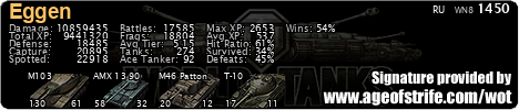 эта подпись в 2020 выглядит как минимум смешно, особенно тетрарх :teethhappy:  А вообще в танки перестал плотно играть году эдак в 2012, заходил эпизодически поиграть когда добавляли новые нации. Так что по нынешним меркам моя стата донная и на свои 52%+ я уже явно не тяну. Надо многое наверстывать