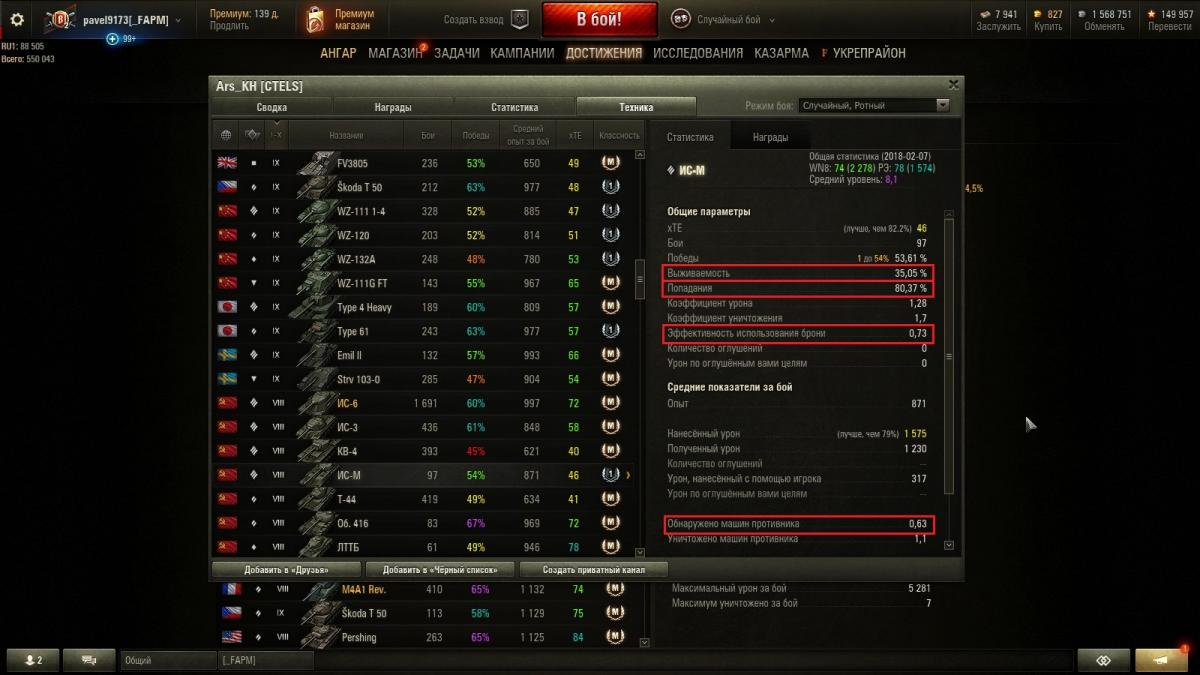 2. Коэффициент использования брони также очень низкий, он должен быть раза в полтора выше. Из этого следует, что нет умения правильно позиционировать танк.
