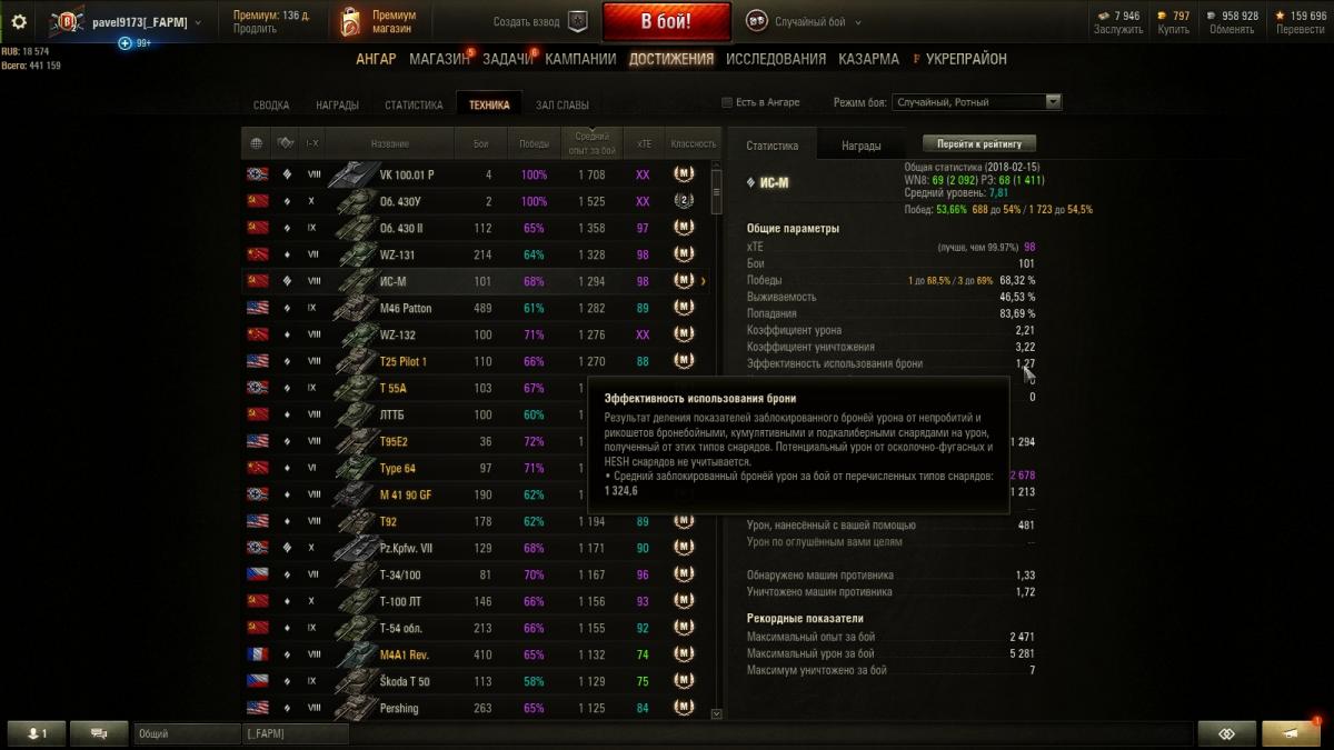Т.е. личный скилл, принятие решений, умение попадать и пробивать, вовремя читать ситуацию на поле боя не рассматриваются? Пробовали анализировать статистику, зависимость статистический показателей и ПП? http://cdn-frm-eu.wargaming.net/wot/ru/uploads/monthly_02_2018/post-2187481-0-13909300-1518635542_thumb.jpg http://cdn-frm-eu.wargaming.net/wot/ru/uploads/monthly_02_2018/post-2187481-0-57646700-1518636566_thumb.jpg Просто смотрим на урон и % побед на всех танках. Составляем график зависимости и делаем выводы.