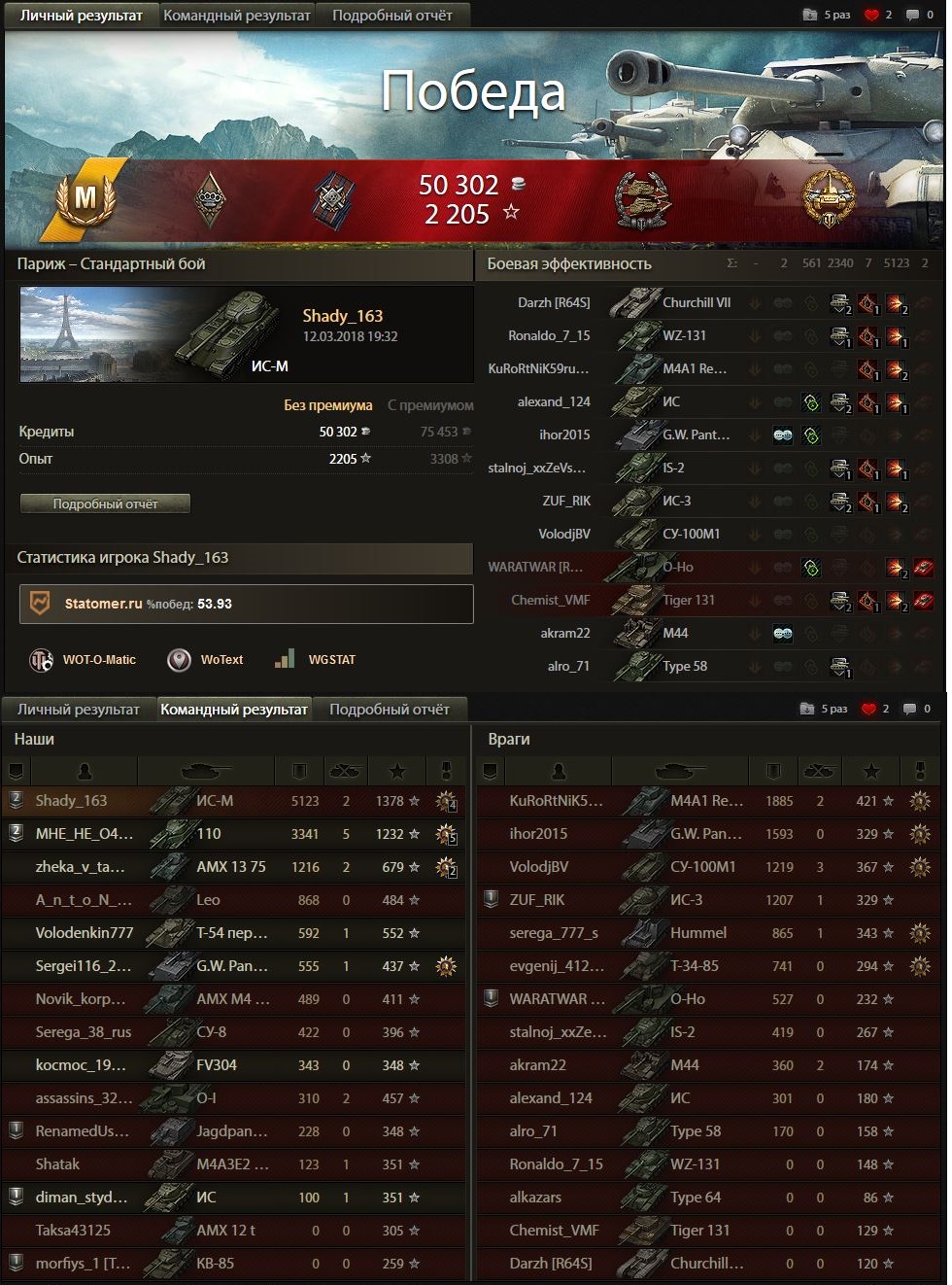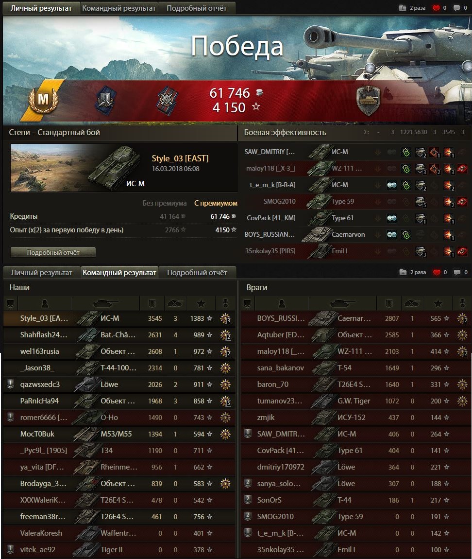 Был как то случай, я с крайслером встретился за поворотом....ну не ждал я его там, это была хохма))) клювали в клинче друг друга и всё до лампочки....он перешёл на фугасы, а у меня их всего 2.....но тогда меня спас т30 ехавший сзади :trollface: Поставил на каток крайслера и уехал далее, а т30 и подоспевший скорп ему уже разъяснили за броню.....далее за поворотом был тайп4, которого я так же поставил на гуслю и мои союзники так же объясняли ему про борта жирдяев)) По итогу боя  ноль дамаги, ноль!!! зато по моему "свету" аж 5к накидали, там ещё кто то получил .... типичный бой для ис-м , но я не в обиде )))
