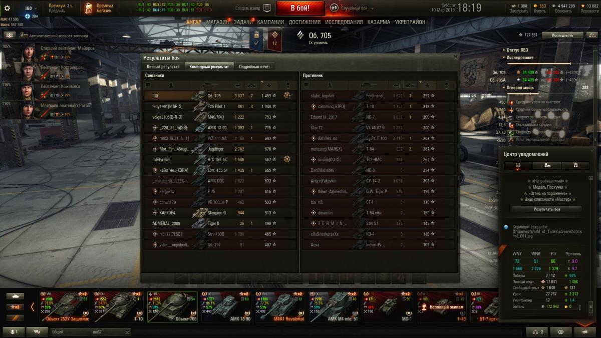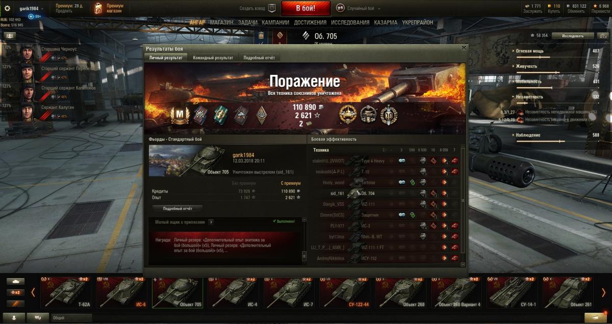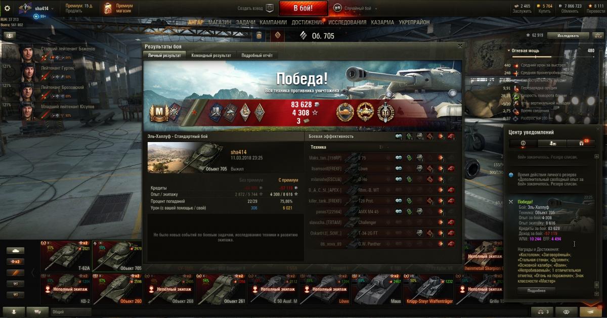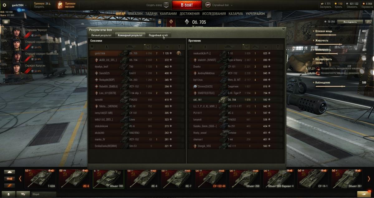 В остальном тоже не согласен с вами, 705-ый даёт возможность установки 2-ух орудий на выбор, кстати КД пушки с альфой 440 быстрее чем на т10, ст-1 или об.257. Запас прочности тоже самый высокий. Самая крепкая башня без уязвимостей. На счёт точности: у меня 82% процента попаданий, я не жалуюсь на неё... Бронирование корпуса может и не рекордное для тяжа 9лвл, но форма рикошетная, везде дикие наклоны и нужно выцеливать(и попадать ещё)-чтобы пробить, по бокам есть фальш-борта,это экраны и они часто добавляют живучести танку.