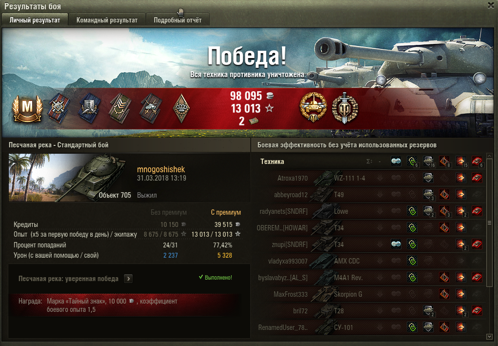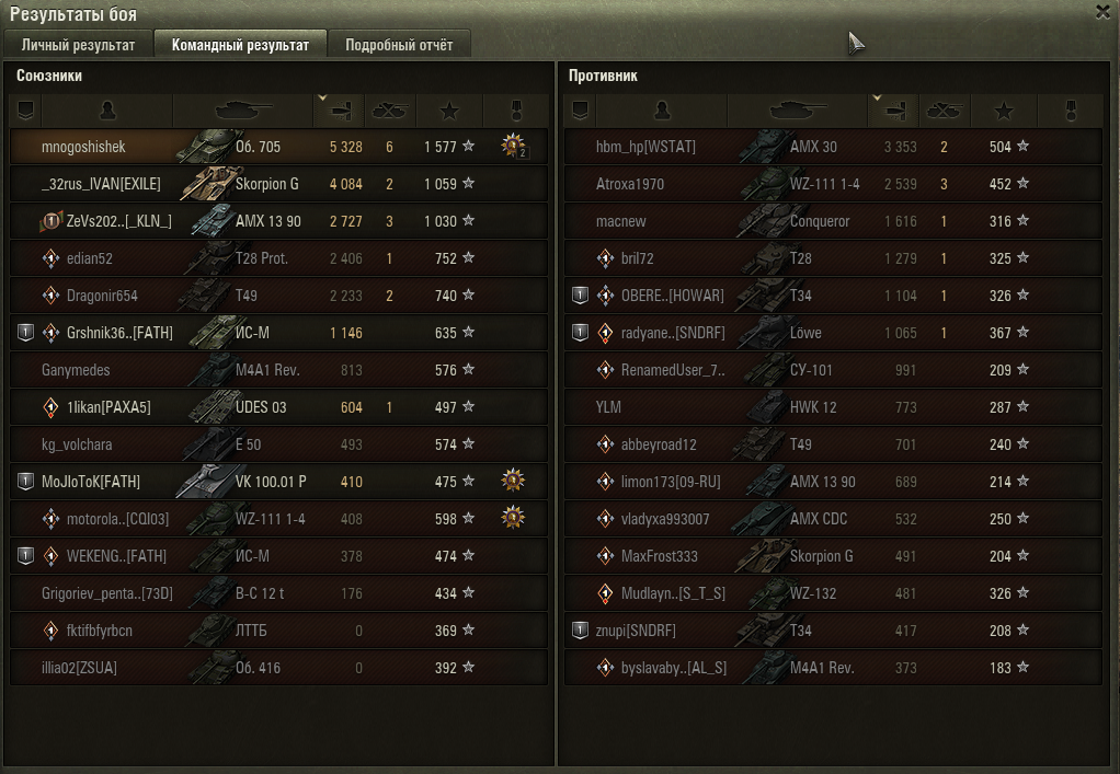По итогу за танк говорит моя статистика. Средний урон держится на уровне 2000 (с тенденцией на понижение), что хуже, чем у Т-10, Т-54, Е-75, Т-55А, М-103 (который я проходил на предтоповом орудии), M46 Patton, AMX 50 120, хуже был только Type 4 Heavy (который откровенный кактус). Что там говорить, у меня даже на Защитнике на данный момент урон больше, чем у Об. 705! Заблокированный урон 0,73 - что говорит о посредственной броне. На самом деле танк может хорош танковать от борта и от башни, но это все нивелируется, когда ты намеренно выкатываешься передом и подставляешь НЛД и борт, чтобы наносить хоть какой то урон. Процент побед также низкий, но это скорее всего частная серия сливов, и боев проведено не так много.
